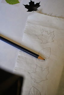 I traced over leaf patterns onto strips of fabric the double the length of the width of the embroidered patchwork, and used a satin stitch on the sewing machine to go around the edges. I used embroidery scissors to cut away sections to leave the following patterns; which for those who don't know is a technique called Cut-Work Embroidery.