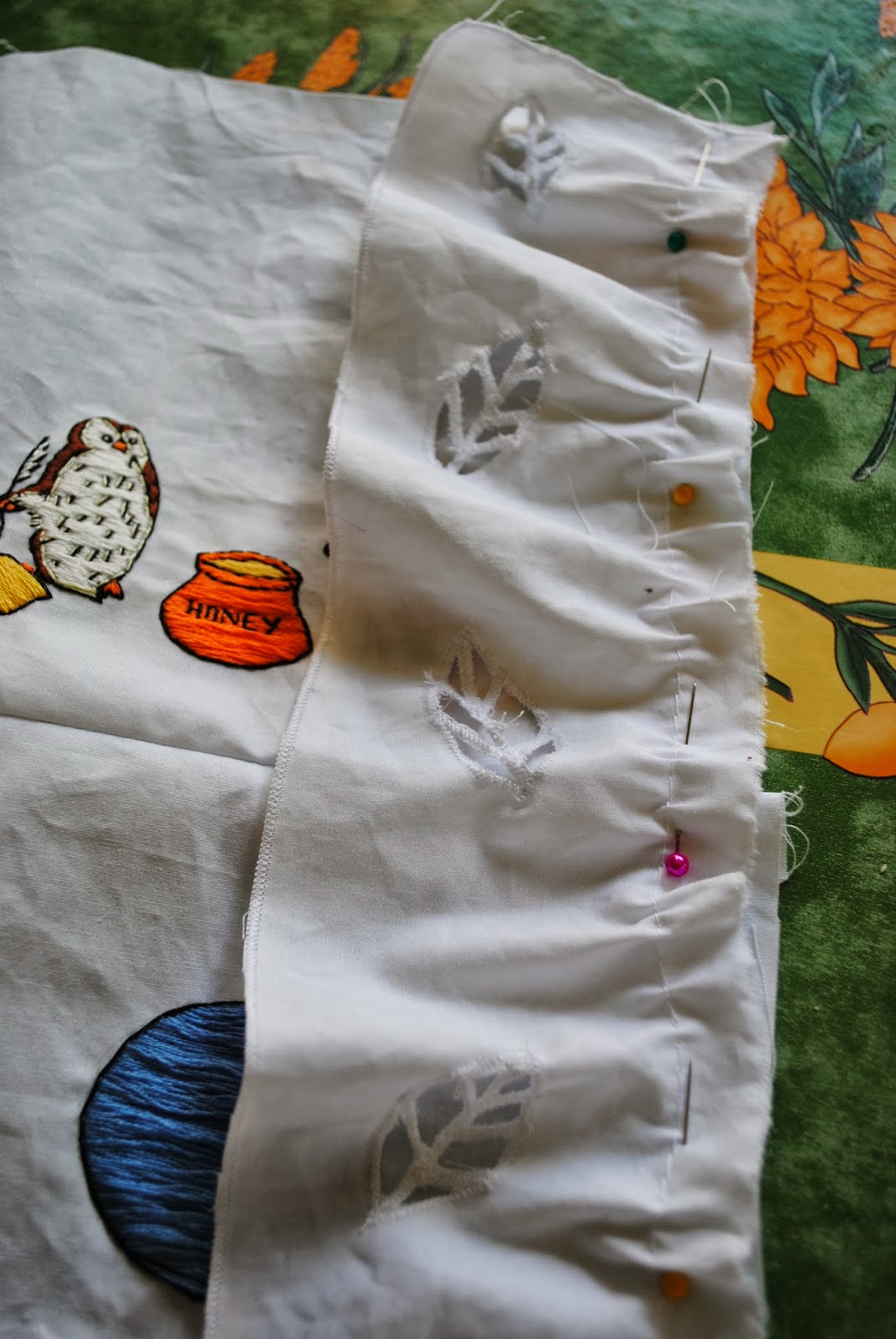 Sadly, I wasn't too keen on the way the maple leaf had turned out, as I wanted a more curved line. So, I ignored those and carried on with the other leaves all the way down the fabric strip. I then put gathering stitches along one edge, pulled them up, and attached each panel to the main panel on either side.